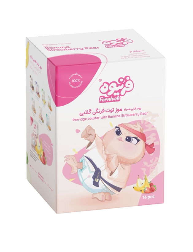 سفر میوه ها در این فرنیوه با موز و توت فرنگی شروع شد و در ادامه راه با گلابی همراه شد تا کودک را از خواص منحصر به فردش بهرهمند سازد، بعلاوه سویق غلات (گندم کامل، برنج، جو کامل) هم که همسفر همیشگی فرنیوه های آی بانو است و مایه رشد و نمو ماجراجوی کوچک می باشد.