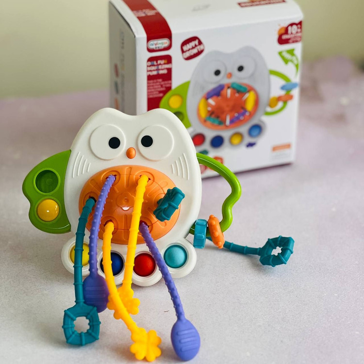 طراحی جغدی بامزه با رنگهای شاد و بافت نرم، باعث تحریک حواس نوزاد میشه و حضور این دوست کوچولوی جغدی در دست شما یا خودش، هم سرگرمکنندهست، هم آرامشبخش.